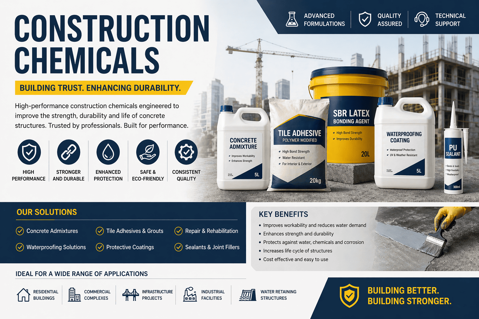 We provide solutions that improve bonding, reduce permeability, and increase resistance against chemicals, moisture, and wear making them ideal for both residential and large-scale infrastructure projects.